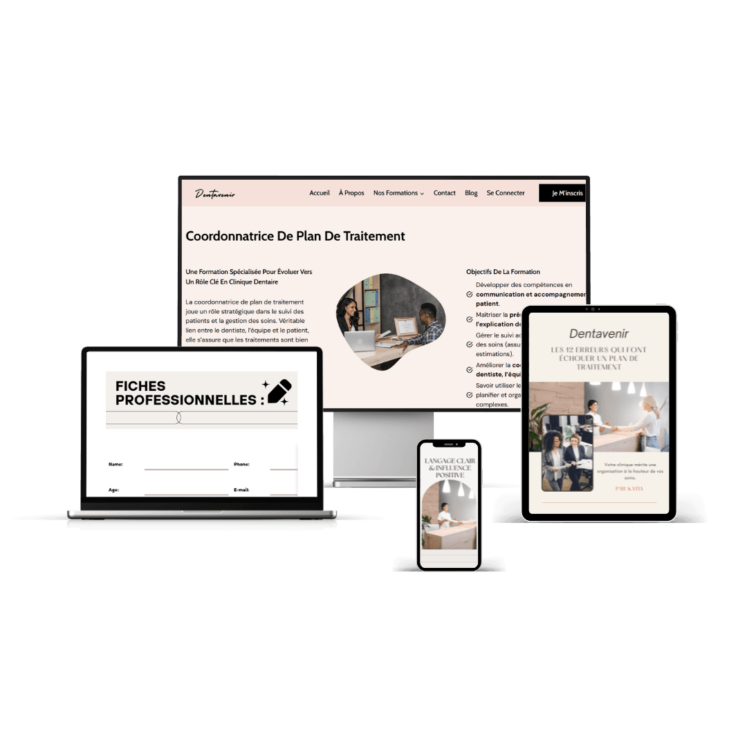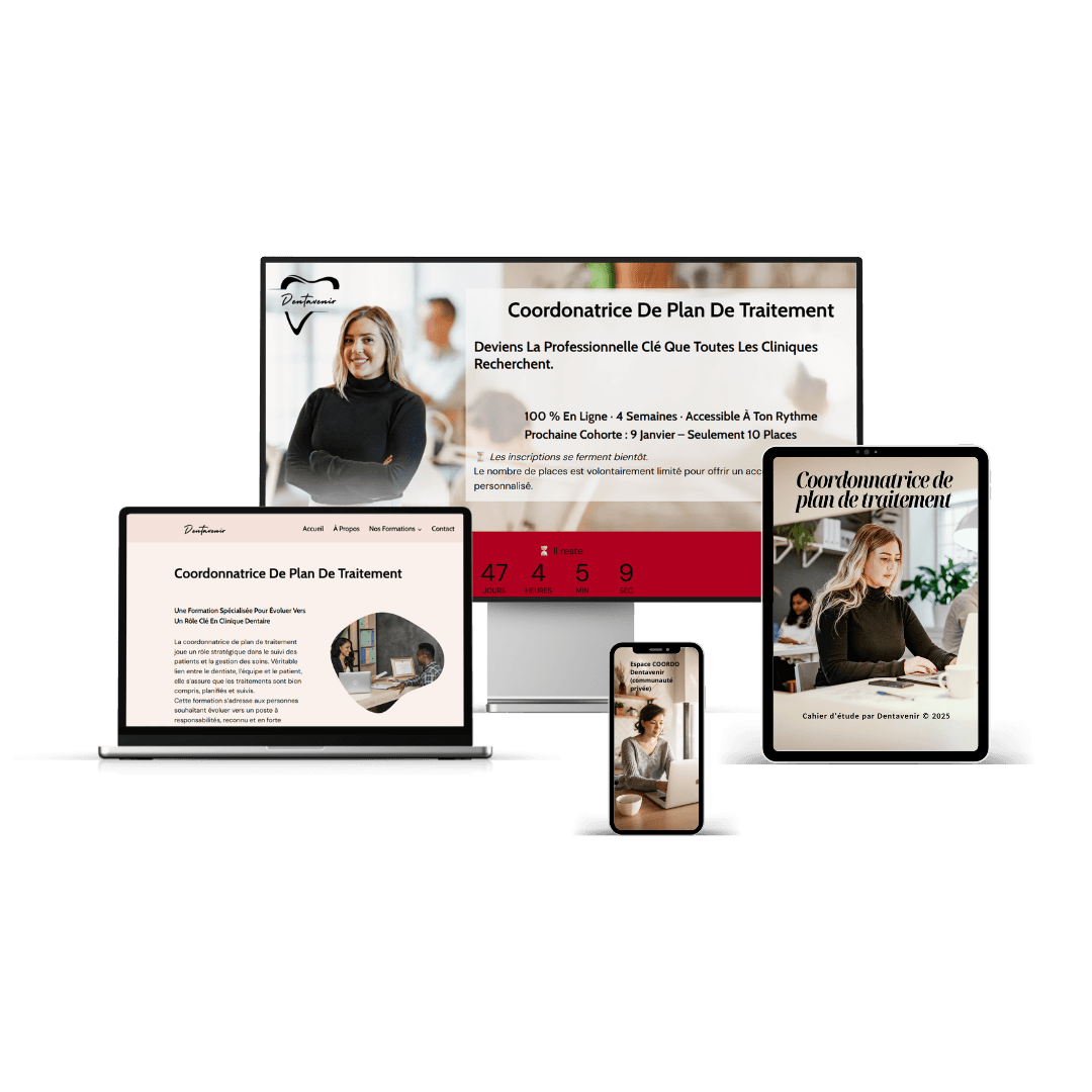 ✓ Tu vas voir que tu n’as pas besoin d’être dentiste ou hygiéniste pour exceller dans la coordination de plans de traitement. Je vais te montrer toutes les bases essentielles : compréhension des traitements, préparation des plans, communication patient et organisation clinique.